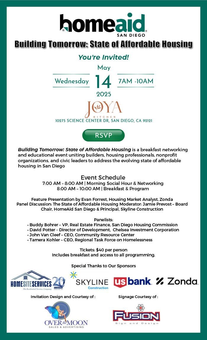Building Tomorrow: State of Affordable Housing is a breakfast networking and educational event uniting builders, housing professionals, nonprofit organizations, and civic leaders to address the evolving state of affordable housing in San Diego.