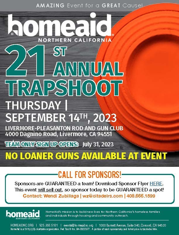 HomeAid NorCal 21st Annual Trap Shoot Thursday, September 14, 2023 7:30 AM 4:00 PM 4000 Dagnino Road Livermore, CA, 94551 United States (map) Google Calendar ICS